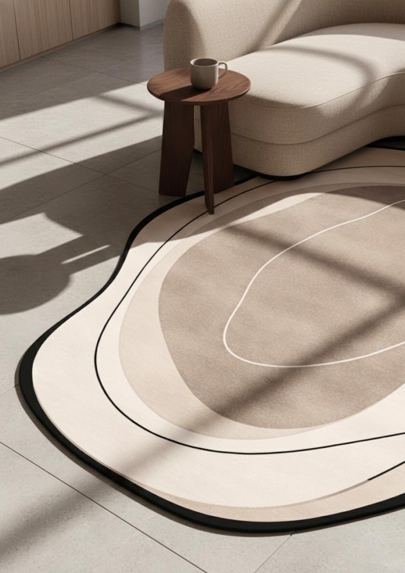 Topos Choco is a sculptural composition inspired by organic landforms and contour lines, designed to bring quiet depth and architectural softness into contemporary interiors. Its fluid silhouette mirrors natural topography, while layered tonal shades of warm chocolate and sand create a sense of movement, shadow, and dimension.