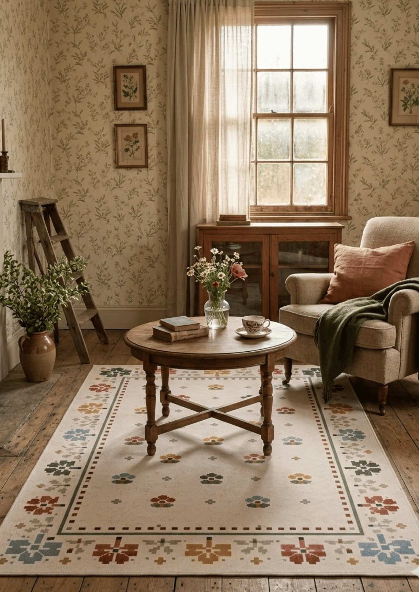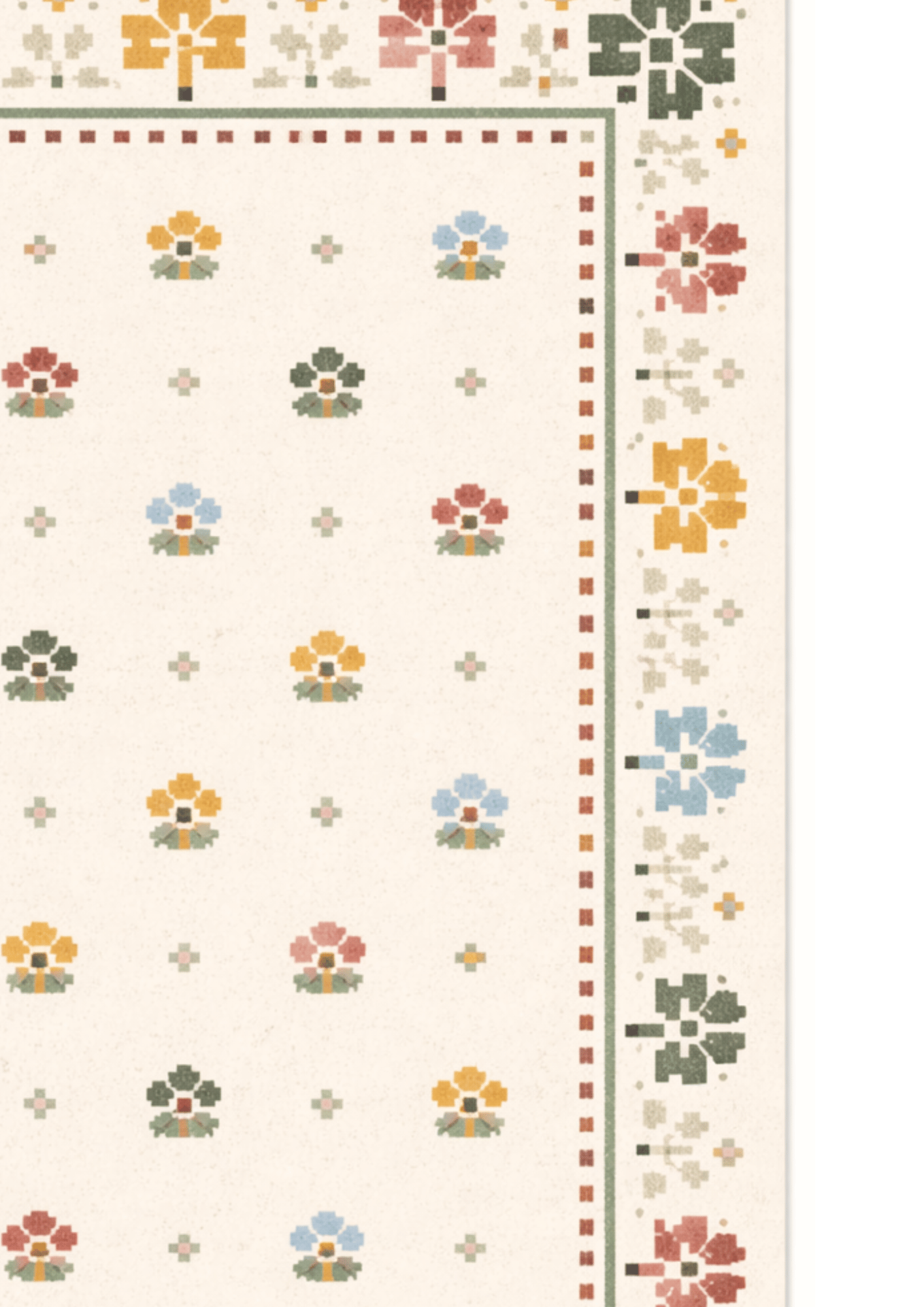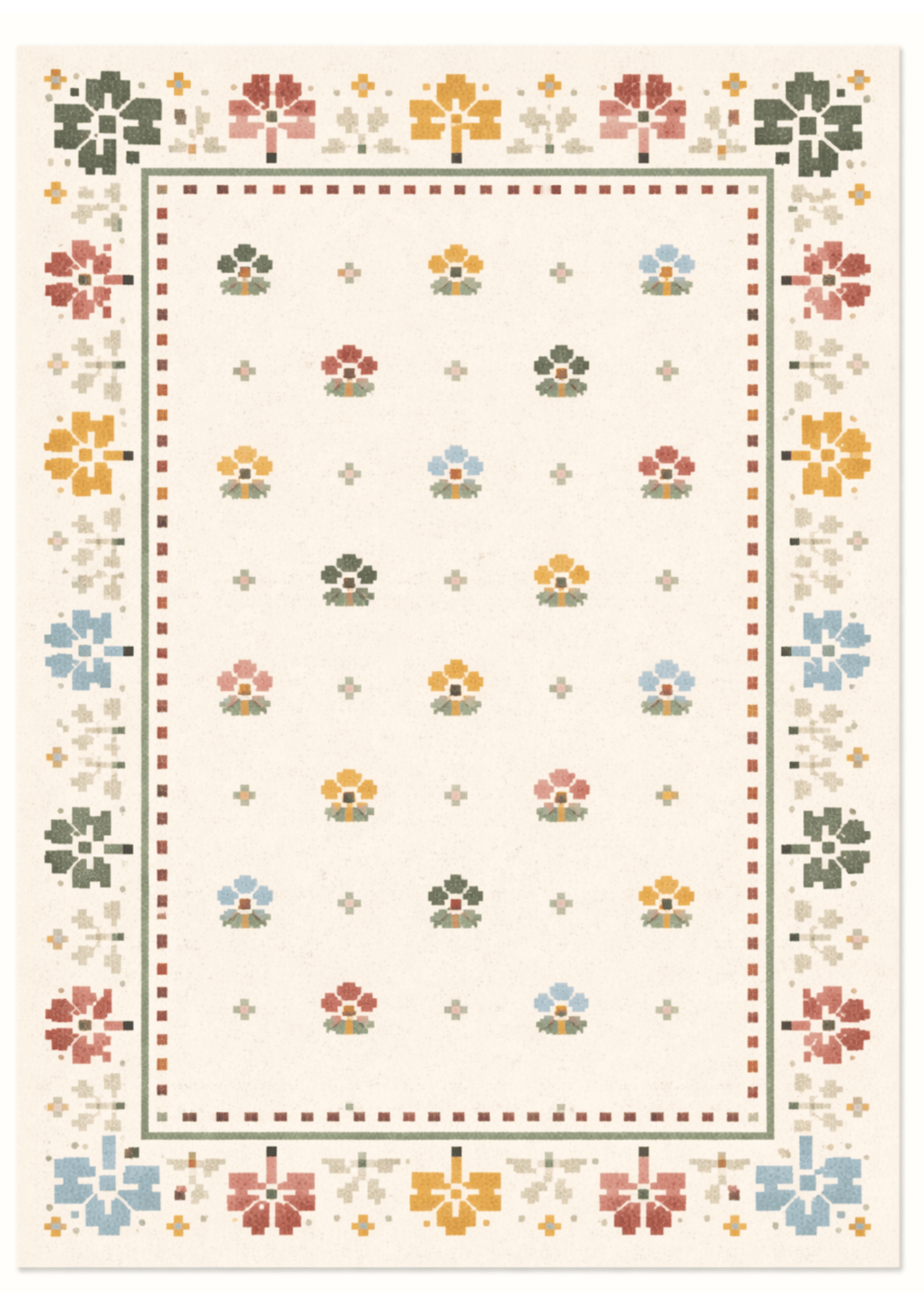 Set on a soft neutral base, the design features delicate, repeated floral motifs in warm and cheerful tones—mustard, rose, sage, and sky blue—framed by a structured border that adds rhythm and balance. The composition feels both playful and refined, bringing a sense of warmth and personality into any space.