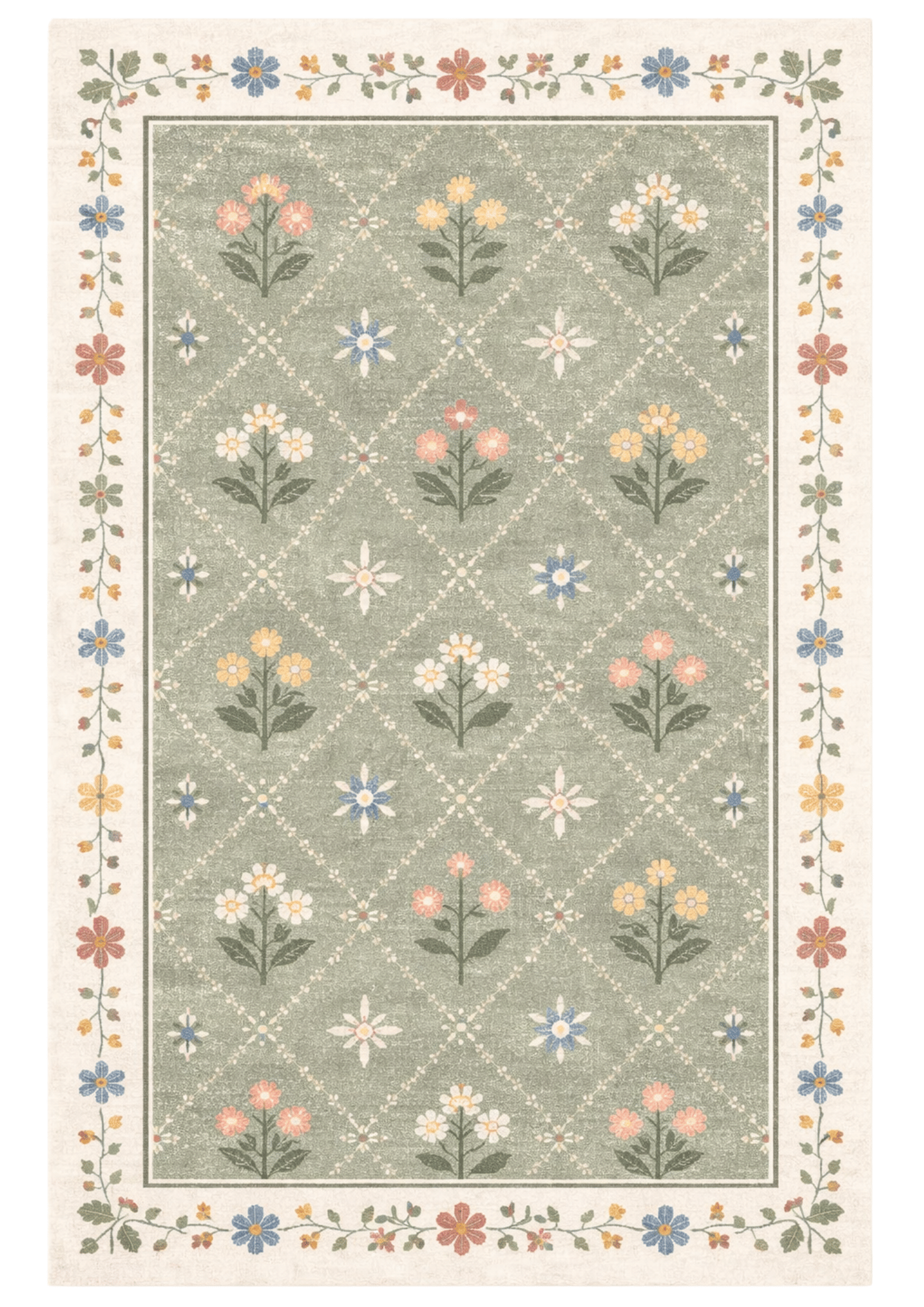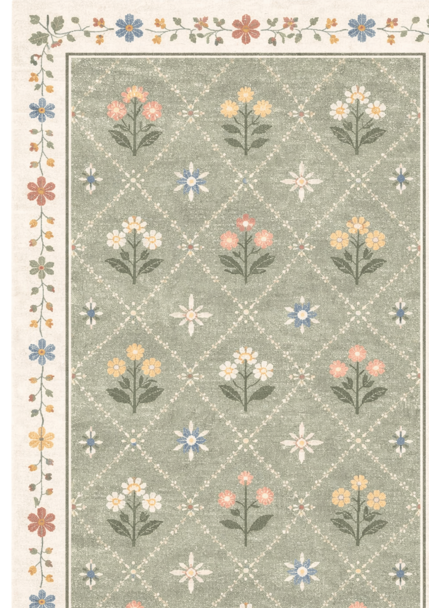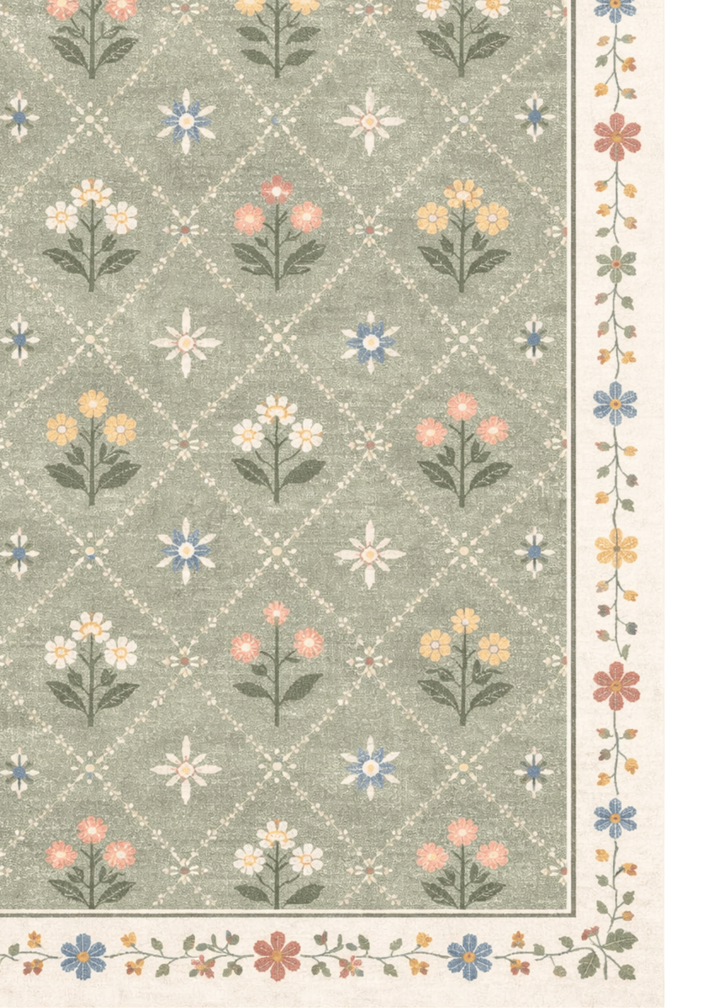 Set against a soft sage green base, the design unfolds through delicate floral motifs arranged in a gentle lattice pattern, framed by an intricately detailed botanical border. The composition feels airy and balanced, bringing a sense of calm, rhythm, and understated elegance into the space.