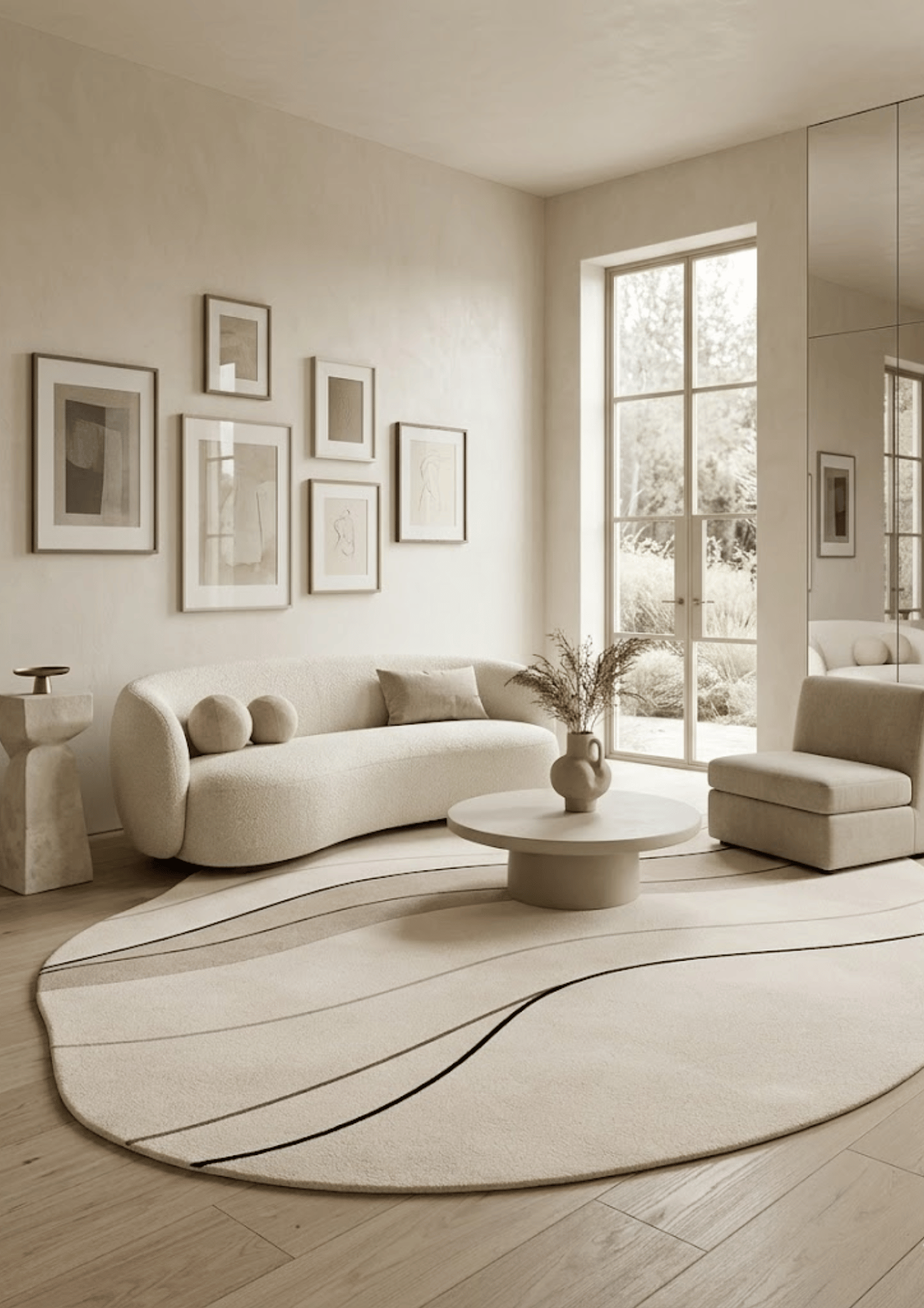 Inspired by the calm of evening light, Saanjh Flow is a handmade wool hand tufted carpet designed for modern living spaces. Its soft neutral base and flowing lines create a sense of quiet movement, bringing balance and warmth to your home.