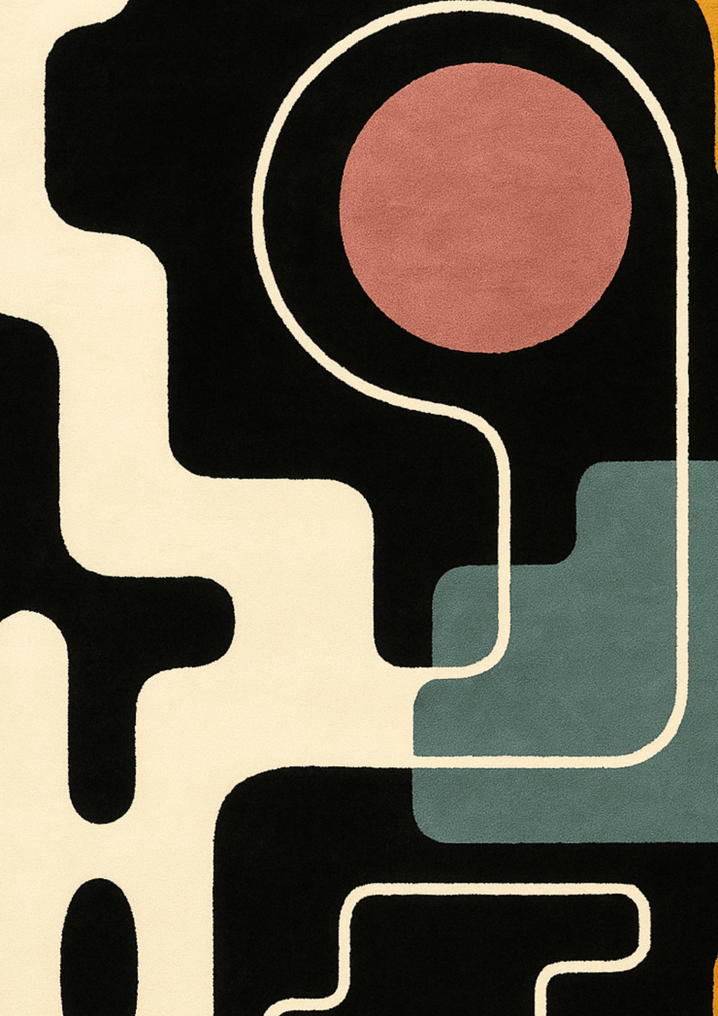 Vekt Wool Handtufted Carpet by HummingHaus embodies the harmony between structure and flow. Designed with modernist precision, it features fluid lines and sculptural blocks of ochre yellow, teal blue, ivory, terracotta, and deep black — creating a dynamic interplay of contrast and calm.